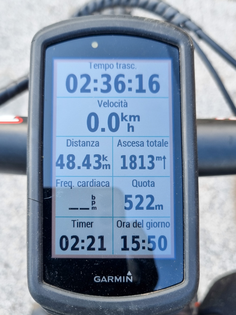 Doveva essere il solito giretto domenicale qui intorno (anzi ho provato un inedito single-track breve ma carino subito dopo la casa cantoniera); quando sulla strada del ritorno ho realizzato che non avevo mai tolto il Turbo (che era come al solito settato a +5 e con tutti i valori massimi) e mi mancava il 36% ho detto, proviamo a portarlo a sfinimento! Il Kiox ha segnato 0% a 1794D+ ma il vero spegnimento si è avuto a 1816 e 48.5km (buono a sapersi che con 0% riesci ancora a fare qualcosa). Come in tutti i miei giri solitari, velocità sempre molto sostenuta, cadenza sempre nell'arco verde (~75rpm), nessuna salita spaccapolmoni ma un mangia e bevi continuo e ovviamente tutto rapportato al mio peso molto contenuto (stamattina 52.4 nudo, ma non ero ancora andato in bagno :-) ).
